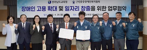 [코리아 이슈저널=김종오 기자] 전라남도교육청은 28일 청사에서 (사)중증장애인복지협회와 장애학생 고용 확대 및 일자리 창출을 위한 업무협약을 체결했다.