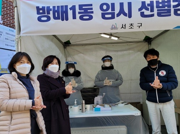김 의원은 지난 2일, 3일에 서초구 방배1동, 4동, 본동 임시선별진료소 3곳을 방문하여 연휴와 지속되는 강추위 속에서도 쉬지 않고 고생하고 있는 의료진들과 공무원들을 격려하고, 현장에서의 어려움과 개선점 등을 점검했다.