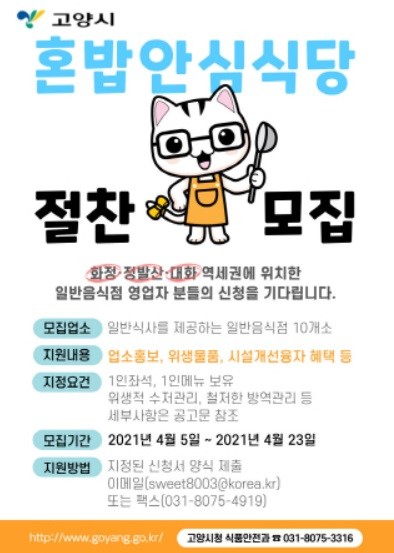 혼밥안심식당으로 지정되는 업소는 지정 스티커 부착과 함께 고양시청 홈페이지(www.goyang.go.kr) 등을 통한 홍보, 위생물품 및 시설개선융자 등의 혜택을 지원받게 된다.