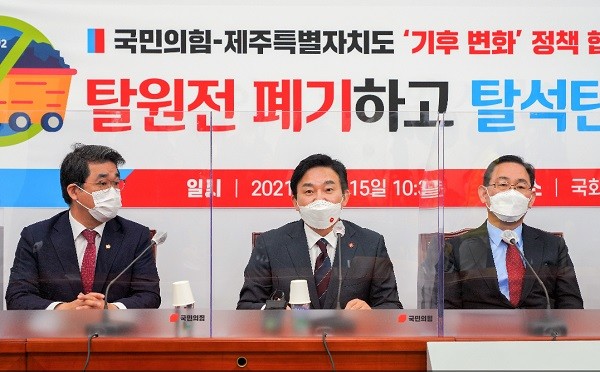 주호영 원내대표는 “10여 년 전부터 원희룡 제주지사는 기후대응 정책을 선도해왔고 한국을 대표하는 청정에너지와 친환경 전기자동차 도시로 제주를 이끌어왔다”고 소개했다. 이어“그간의 경험과 연구를 바탕으로 대한민국이 추구해야 할 기후에너지 정책 방향에 대해 고견을 나누고자 한다”며 이날 회의의 목적을 밝혔다.