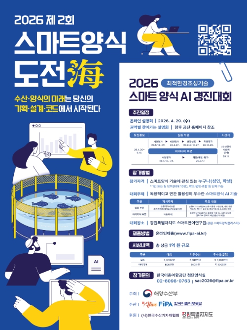 [코리아 이슈저널=최준석 기자] 해양수산부와 한국어촌어항공단(이사장 홍종욱)은 4월 20일부터 5월 15일까지 ‘제2회 스마트양식 도전해(海) 경진대회’의 공모를 실시한다고 밝혔다.