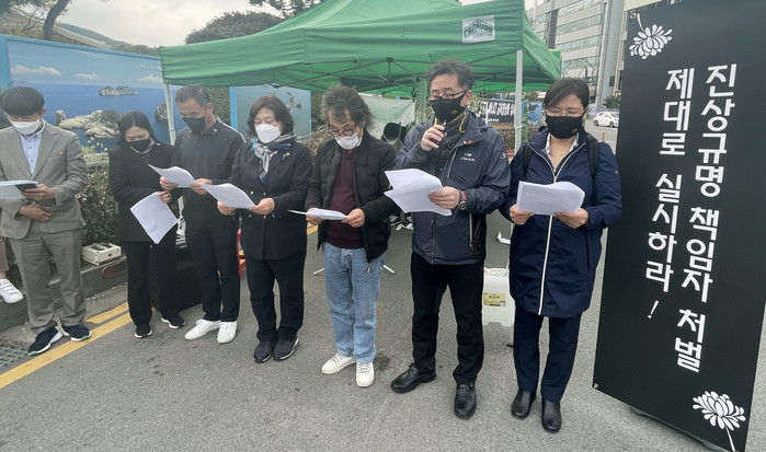 ▲ 특성화고 현장실습 피해자 가족 모임이 20일 오후 전남 여수시청 앞에 마련된 故 홍정운 군의 추모 헌화소 앞에서 현장실습 폐지를 촉구하고 있다. 여수의 한 특성화고 3학년이던 홍정운군은 지난 6일 현장실습을 나간 요트에서 따개비 작업을 하다 물에 빠져 숨졌다. 2021.10.20 [연합뉴스 제공]