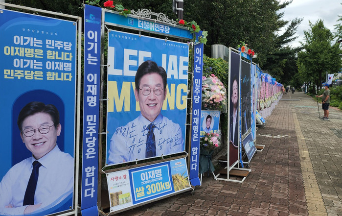 [열린의정뉴스 = 김윤영 기자] 더불어민주당 이재명 대표의 임기가 시작된 29일 서울 여의도 국회 앞에 이 대표의 당선을 축하하는 화환이 놓여 있다. 2022.8.29 [국회사진기자단]