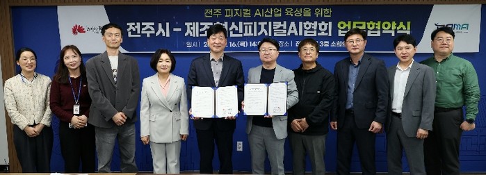 시와 제조혁신피지컬AI협회는 16일 시청 3층 소회의실에서 윤동욱 전주시장 권한대행 부시장과 조용로 협회장 등 양 기관 관계자들이 참석한 가운데 ‘피지컬 AI 산업 육성을 위한 업무협약’을 체결했다.