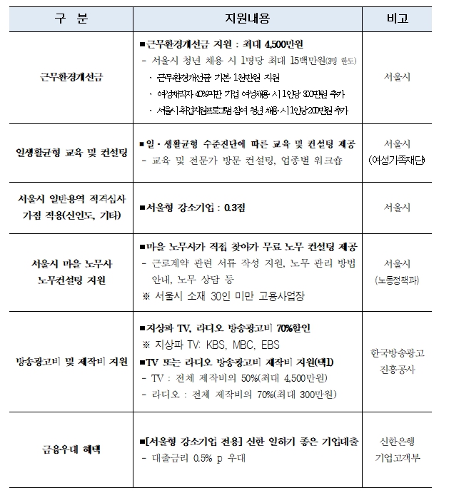 먼저, 서울에 거주하는 18세~39세 이하 청년을 정규직으로 신규 채용하면, 1인당 최대 1,500만 원씩 기업당 3명까지 총 4,500만 원의 ‘근무환경개선금’을 지원한다.