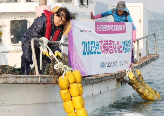 이번 5월 29일에는 전체 방류량 47톤 중 5톤을 내리어촌계 체험어장에 살포했다.