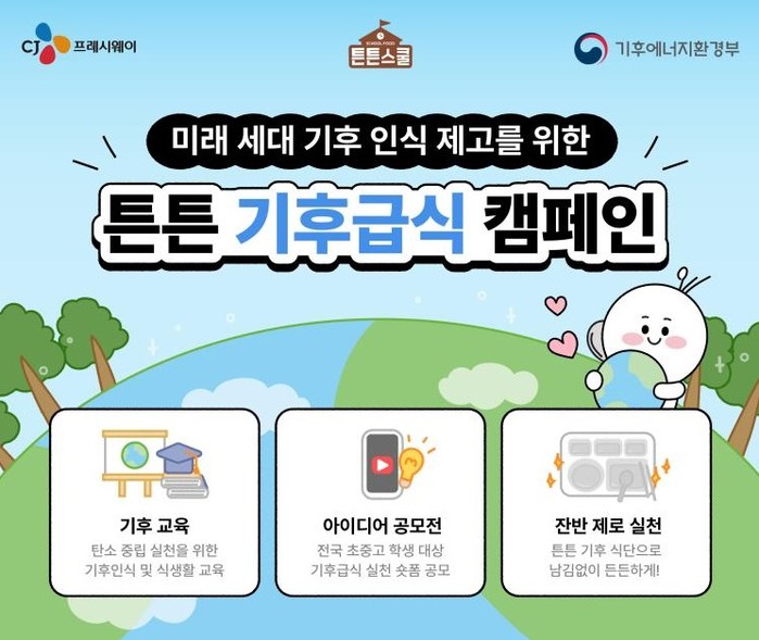 CJ프레시웨이의 학교급식 특화 브랜드 ‘튼튼스쿨’이 기후에너지환경부와 협력해 ‘기후급식 캠페인’을 추진한다.