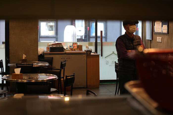 | ▲ 지난 16일 오후 서울 서초구 한 음식점 사장이 방역수칙 강화 관련 뉴스를 보고 있다. 정부는 오는 18일부터 내년 1월 2일까지 전국의 사적모임 인원을 4인으로 제한하는 등 방역수칙을 강화하기로 했다. 2021.12.16 [연합뉴스 제공] |