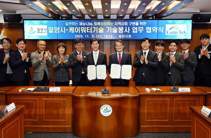 [코리아 이슈저널=김태훈 기자] 경남 밀양시와 케이워터기술(주)(대표 정승용)은 5일 시청 소회의실에서 ‘실천하는 재능나눔, 함께 성장하는 지역사회 구현을 위한 기술봉사 업무협약’을 체결했다고 밝혔다.