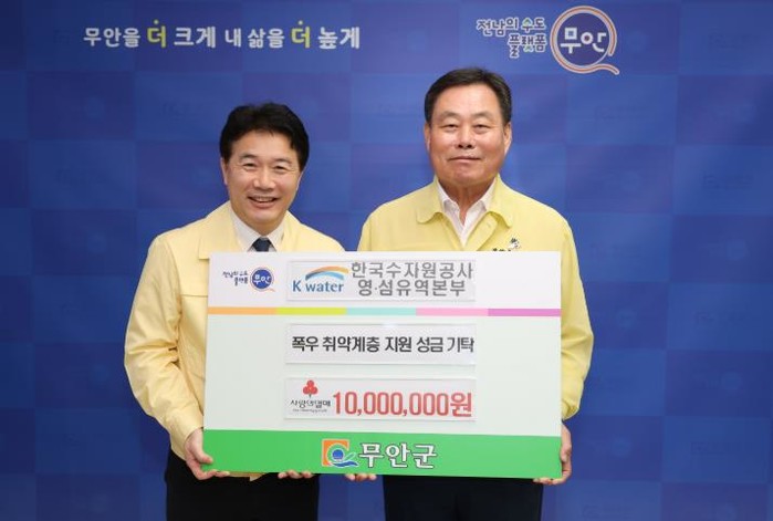 [코리아 이슈저널=김종오 기자] 전남 무안군은 11일, 한국수자원공사 영·섬유역본부로부터 호우피해 복구, 군민 지원을 위한 성금 1,000만원을 기탁받았다.
