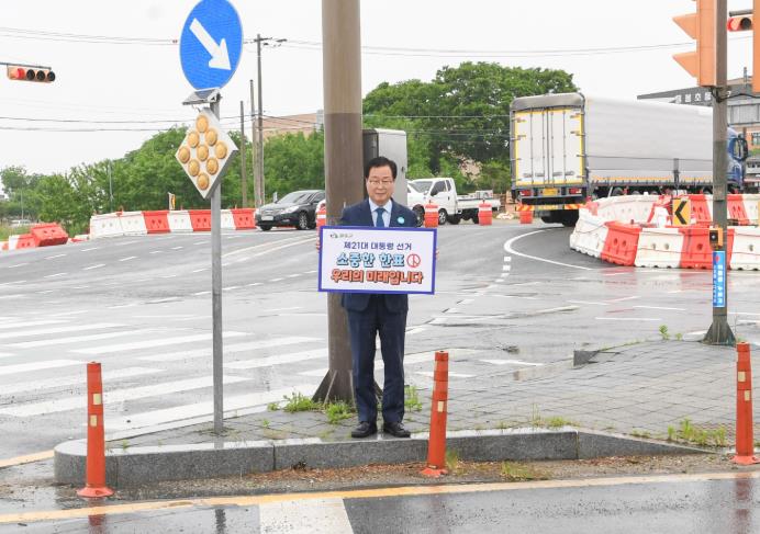 16일 유 군수는 지역 주민들에게 선거에 적극적으로 참여할 것을 촉구하며, 교차로에서 직접 투표 참여를 홍보하는 판넬을 들고 현장에 나섰다.