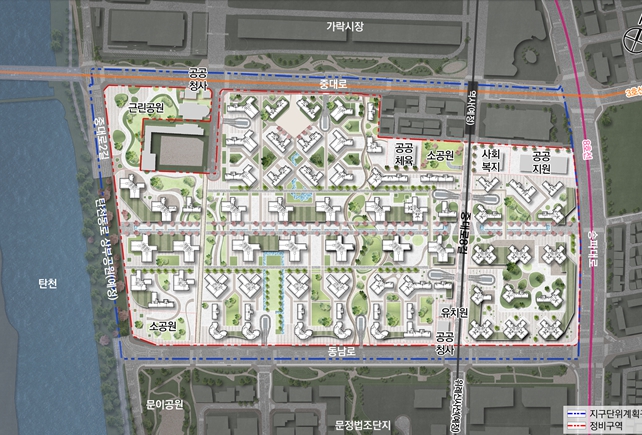 가락시장역 부근에는 단지 주민은 물론 누구나 이용할 수 있는 사회복지시설과 공공체육시설, 공공지원시설 등 다양한 공공시설을 배치하고, 현재 중대로에 있는 문정2동 주민센터는 이전해 주민 이용 편의를 한층 높인다는 계획이다.