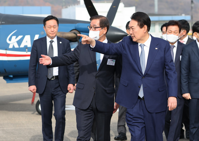 | ▲ 윤석열 대통령이 24일 오전 경남 사천시 한국항공우주산업(KAI)을 방문해 전시된 KC-100, KT-1, FA-50 등을 참관하고 있다. 2022.11.24 |