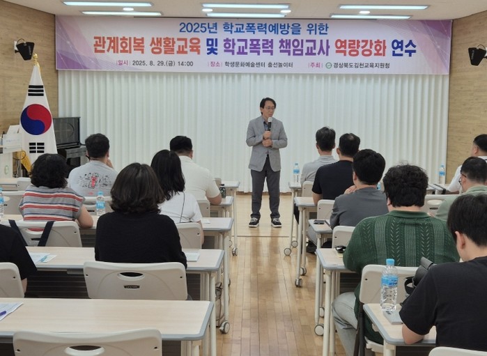 [코리아 이슈저널=김태훈 기자] 경상북도김천교육지원청은 8월 29일 학생문화예술센터 춤선놀이터에서 관내 초·중·고 및 각종학교의 학교폭력책임교사와 희망 교사를 대상으로 '2025학년도 관계 회복 생활교육 및 학교폭력책임교사 역량강화 연수'를 개최한다.