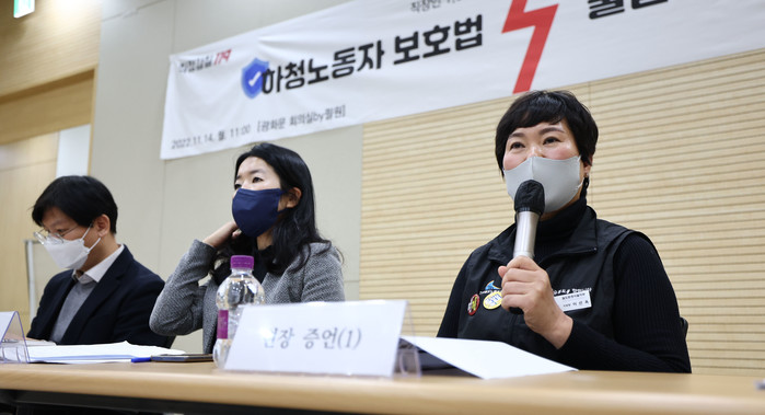 ▲ 14일 오전 서울 종로구 광화문 필원에서 열린 직장인 1,000명 원청갑질 특별설문조사 발표회에서 이선옥 코레일테크 청소노동자(오른쪽)가 현장 증언을 하고 있다. 2022.11.14
