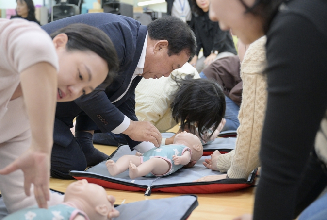 [코리아 이슈저널=최용달 기자] 최민호 세종특별자치시장이 21일 종촌동 육아종합지원센터에서 ‘찾아가는 현장소통’을 열고 영유아 학부모 40여 명과 함께 심폐소생술을 재숙지하고 응급대처의 중요성을 공유했다.