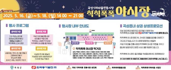 [코리아 이슈저널=김종오 기자] 곡성군이 곡성기차마을전통시장에서 지역 상권 활성화와 전통시장 브랜딩을 위한 야간형 장터, ‘2025 칙칙폭폭야시장’을 오는 5월 16일부터 18일까지 3일간 개최한다고 전했다.