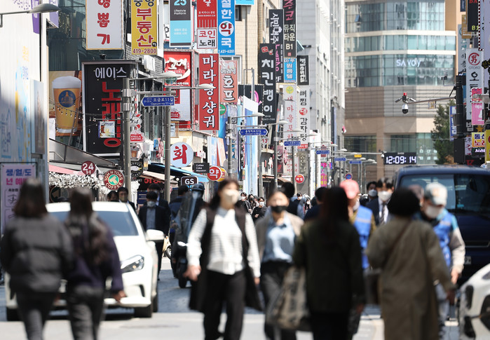 | ▲ 정부가 사회적 거리두기 도입 2년 1개월 만에 전면 해제를 결정한 15일 서울 시내의 한 식당가에서 마스크를 쓴 시민들이 이동하고 있다. 2022.4.15 |