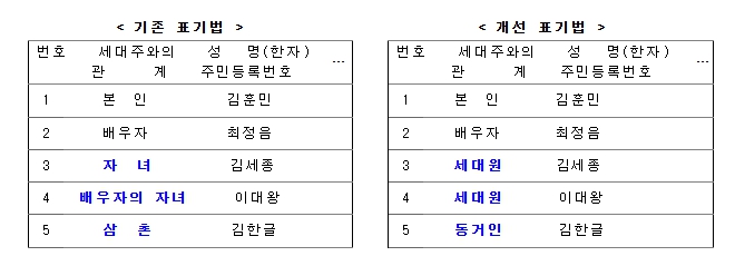 [코리아 이슈저널=최용달 기자] 앞으로는 등·초본 상 가족 관계 표기로 인한 재혼 가정의 사생활 노출을 방지하기 위해 세대주와의 관계 표기 방식이 개선된다.