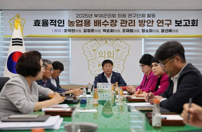 [코리아 이슈저널=홍춘표 기자] 부여군의회는 지난 25일 오후 의정협의회실에서 부여군의회 의원연구단체인 '스마트한 재난 대응 실현 연구모임'의 ‘효율적인 농업용 배수장 관리 방안 연구용역 착수보고회를 개최했다.