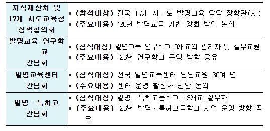 제2부 발명교육 소통의 장에서는 지식재산처-17개 시도교육청 정책협의회를 비롯하여 발명교육 연구학교, 발명교육센터, 발명·특허 고교 간담회를 각각 개최하여 현장 의견을 청취할 예정이다.