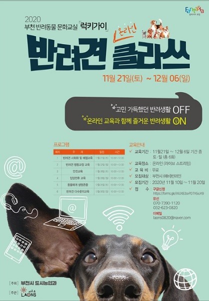 [열린의정뉴스 = 김진성 기자] 부천시는 반려동물 천만 시대를 맞아 12월 6일까지 반려동물 문화교실 ‘반려견 On-Line 클라쓰’를 운영한다.