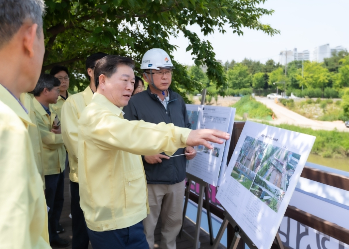 | ▲ 박승원 광명시장이 19일 오전 목감천 하천정비사업 공사 현장에 방문해 여름철 재난 대응 안전 점검을 하고 있다. |