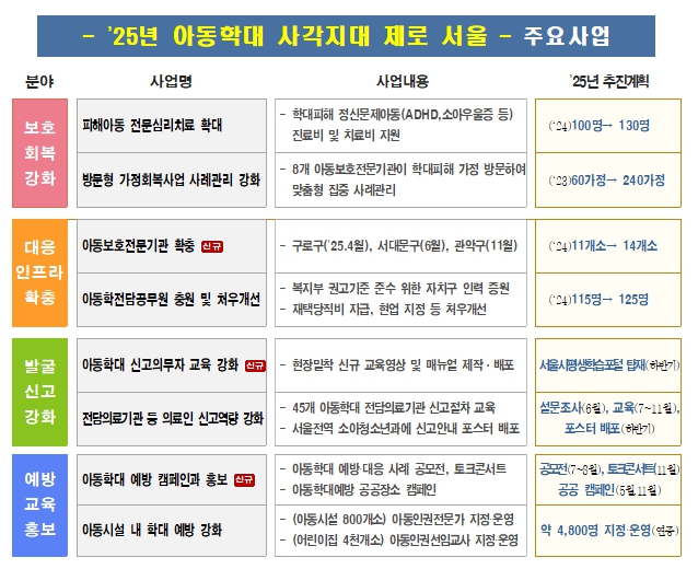 아동학대 조기발견을 위한 초기대응도 강화된다. 서울시는 매 분기별 예방접종·영유아건강검진 미실시, 장기결석 등 44종의 사회보장 빅데이터를 활용해 4,000여 명의 위기 징후 아동 조사를 실시 중이며, 특히 5~6월에는 경찰, 자치구, 아동보호전문기관 합동으로 고위험군 아동(반복신고, 사례관리·가정방문 거부 등)에 대한 점검을 실시하고 있다.