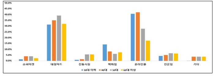 농식품 주요 구매처는 여전히 대형마트를 선호하는 것으로 조사됐다. 신선식품을 구매할 때는 대형마트(46.2%)와 전통시장(18.2%)을 주로 찾았다. 가공식품과 선물 세트는 온라인 구매 비중(33.2%)이 높았다.