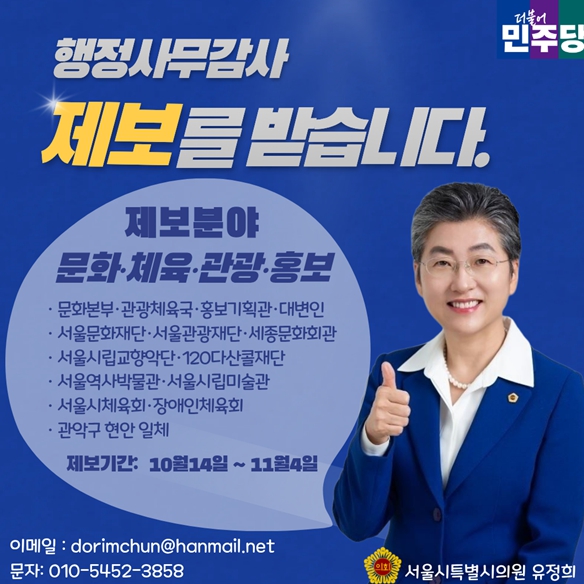 [코리아 이슈저널=최성일 기자] 서울특별시의회 문화체육관광위원회 유정희 의원(더불어민주당, 관악4)은 10월 14일부터 11월 4일까지 시민 의견을 직접 접수받는 ‘행정사무감사 시민제보창구’를 운영한다고 밝혔다.