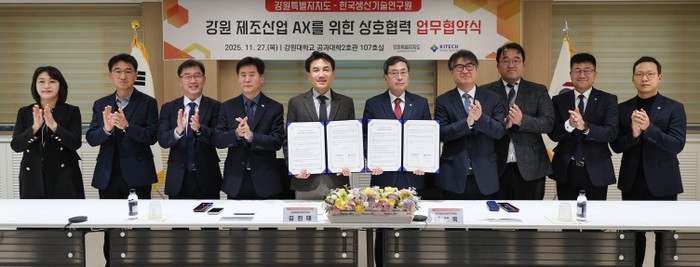 [코리아 이슈저널=최제구 기자] 강원특별자치도는 11월 27일 오후 3시, 강원 제조산업의 AX(AI Transformation, 인공지능 전환)를 위한 상호 협력을 강화하기 위해 한국생산기술연구원(원장 이상목)과 업무협약(MOU)을 체결했다.