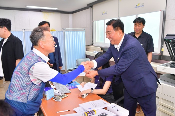[코리아 이슈저널=김종오 기자] 김한종 장성군수가 ‘민생회복 소비쿠폰’ 지급이 시작된 21일 장성읍 행정복지센터를 방문해 공직자들을 격려했다. 김 군수는 “지역경제 회복의 신호탄이 될 것”이라며 “경기침체와 비 피해로 어려움이 가중된 군민들에게 도움이 되길 바란다”고 말했다.