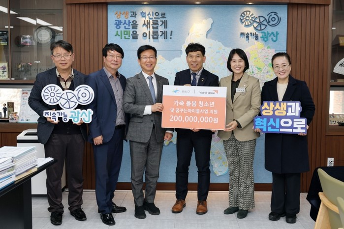 지난 16일 광산구청에서 박병규 광산구청장, 사회복지법인 월드비전 광주전남사업본부, 송광‧첨단‧행복드림 등 3개 광산구 종합사회복지관, 박미옥 광산구의원 등이 참석한 가운데 가족돌봄청소년 사업 지원금 2억 원 전달식이 열렸다.