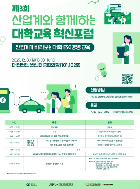 [코리아 이슈저널=최용달 기자] 교육부는 한국공학교육인증원(원장 김우승), 대전테크노파크(원장 김우연) 대전 라이즈센터와 함께 12월 8일(월), 대전컨벤션센터에서 ‘제3회 산업계와 함께하는 대학교육 혁신포럼’을 개최한다.