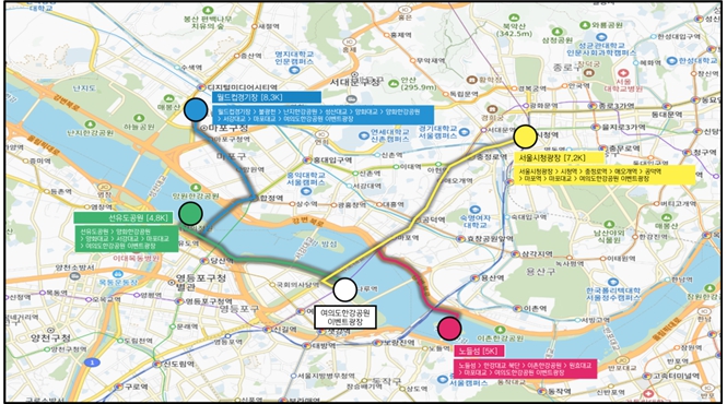 초심자의 경우 아름다운 한강을 배경으로 가볍게 달려보는 선유도공원(4.8km)과 노들섬(5km) 코스를 추천하며 평소에 러닝을 즐겨하는 시민이라면 서울광장(7.2km)과 월드컵경기장(8.3km) 코스에 도전해볼 만하다.