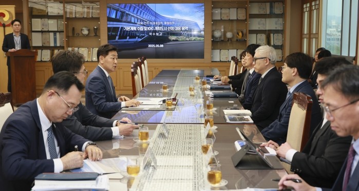 ▲ 8일 전북특별자치도청 회의실에서 열린 전주 하계올림픽.패럴림픽 기본계획 수립 및 IOC 개최도시 선정 대응 용역 착수 보고회에 김관영 도지사를 비롯한 참석자들이 보고회를 갖고 있다 |