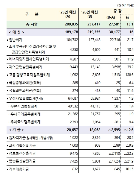 [코리아 이슈저널=최용달 기자] 과학기술정보통신부는 정부안 대비 746억원 증액된 총 23조 7,417억원 규모의 과기정통부 2026년도 정부 예산 및 기금운용계획이 12월 2일 국회 본회의 의결을 통해 최종 확정됐다고 밝혔다.