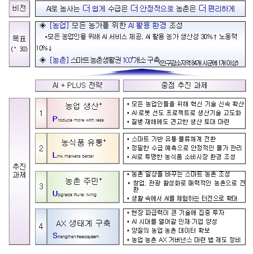 이번 전략은 ‘인공지능(AI)으로 농사는 더 쉽게, 수급은 더 안정적으로, 농촌은 더 편리하게’를 비전으로 설정하고, 이를 실현하기 위해 ① 농업 생산성 혁신, ② 농식품 유통구조 고도화, ③ 농촌 주민 삶의 질 개선, ④ 인공지능 전환(AX) 생태계 기반 조성 등 4대 분야를 설정하고 13대 과제를 중점적으로 추진할 계획이다.
