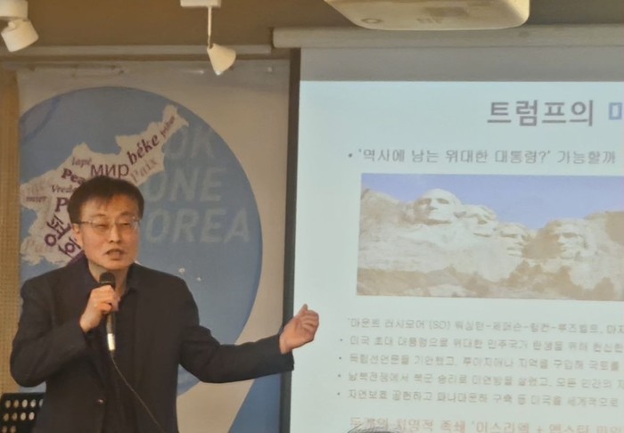 | ▲ 7일 AOK 회원들이 로창현 기자의 'AI, 다시 남북의 봄을 말하다' 의 신간 설명을 듣고 있다. |