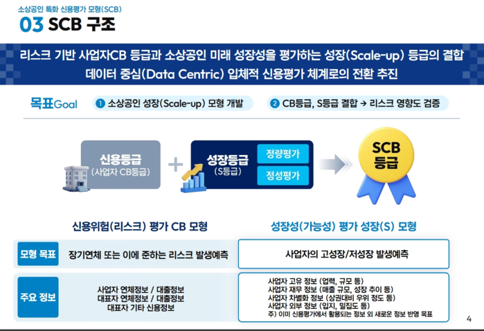 이에 따라 금융위는 같은 달 말 소상공인 신용평가 개선을 위한 현장 간담회에서 소상공인 특화 신용평가모형(SCB) 개발 계획을 밝힌 바 있다.