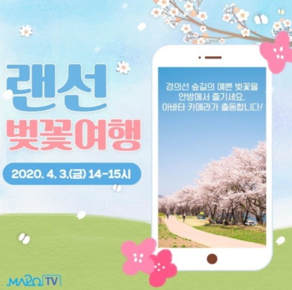유동균 마포구청장은 "봄기운이 완연한 요즘, 사회적 거리 두기로 외출은 최대한 자제하고 집안에서 생활하시는 구민들을 위해 특별히 '랜선 벚꽃여행'을 준비했다"며 "온라인으로 생중계되는 경의선 숲길의 벚꽃 풍경을 통해 따뜻하고 희망찬 봄의 기운을 받으시길 바란다"고 말했다.