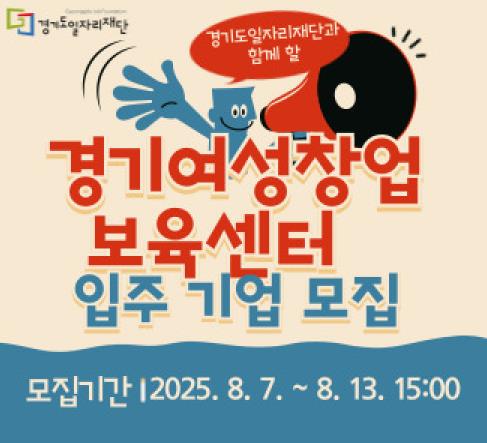 [코리아 이슈저널=홍춘표 기자] 경기도일자리재단은 여성 창업 활성화와 유망 여성 창업기업 육성을 위해 ‘2025년 경기도여성창업보육센터 신규 입주기업 모집’ 공고를 지난 1일부터 게시하고 오는 8월 7일부터 8월 13일 오후 3시까지 접수받는다.