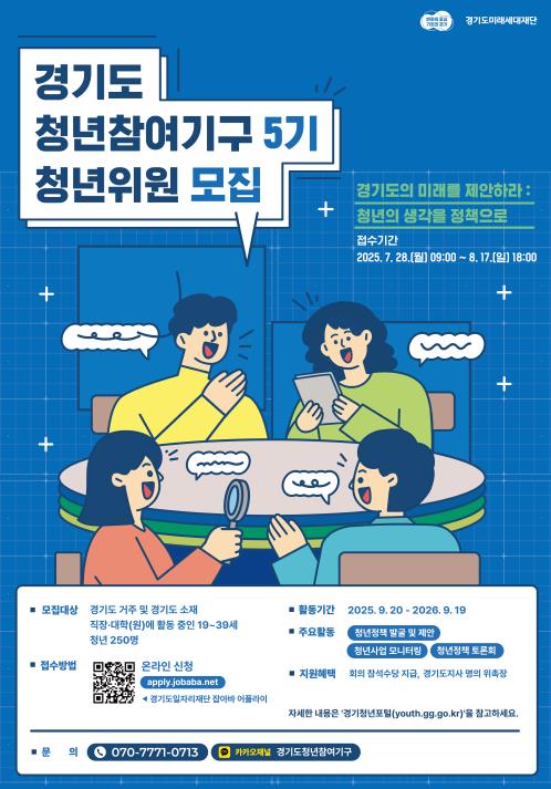 [코리아 이슈저널=홍춘표 기자] 경기도와 경기도미래세대재단은 청년들이 직접 청년정책을 발굴하고 제안할 수 있는 ‘제5기 경기도 청년참여기구’ 위원을 오는 8월 17일까지 모집한다.