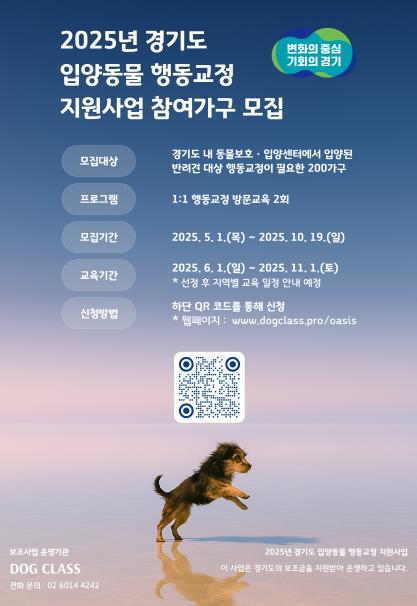 [코리아 이슈저널=홍춘표 기자] 경기도는 입양동물의 가정 내 적응을 돕고, 유기동물 예방과 파양율 감소를 목표로 하는 ‘2025년 경기도 입양동물 행동교정 지원’ 사업 참여 신청 기한을 당초 5월 말에서 10월 19일로 연장하기로 했다고 27일 밝혔다.