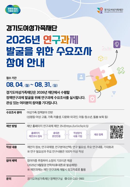[코리아 이슈저널=홍춘표 기자] 경기도여성가족재단은 이달 31일까지 경기도, 31개 시군과 경기도민, 유관기관 및 단체 등을 대상으로 ‘2026년 연구과제 수요조사’를 진행한다.