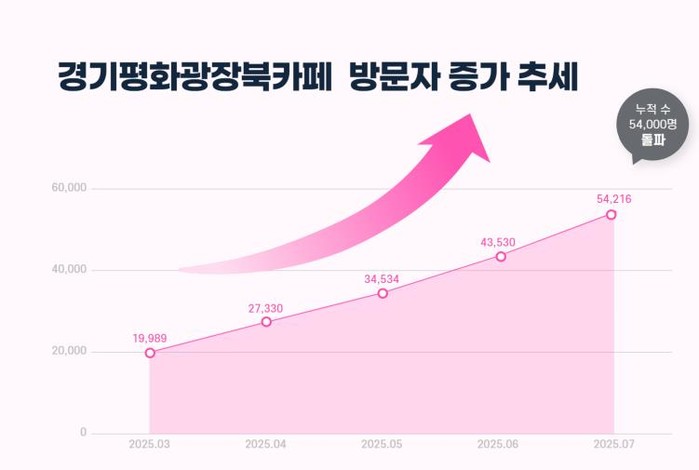경기평화광장 북카페의 누적 방문자 수는 꾸준히 증가세를 보이고 있다. 3월 19,989명, 4월 27,330명, 5월 34,534명, 6월 43,530명, 7월에는 총 5만 4천216명을 돌파해, 북카페가 도민 생활 속 대표적인 문화공간으로 자리 잡고 있음을 보여준다.