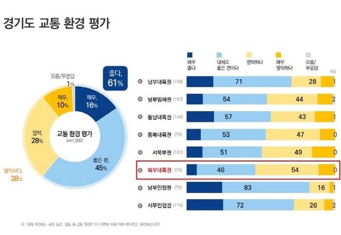 현재 교통환경에 대해서는 응답자의 61%가 ‘좋다’고 평가했으며, 최근 3년간 교통환경이 ‘좋아졌다’고 응답한 비율은 76%에 달했다. 특히 북부내륙권(의정부·양주·동두천·포천·연천)의 경우 현재 만족도는 46%로 상대적으로 낮았지만, 최근 3년간 교통환경이 개선됐다는 응답이 86%로 높게 나타나 도민들이 정책 효과를 체감하고 있는 것으로 분석됐다.