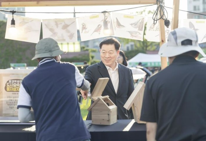 | ▲ 박승원 광명시장이 지난12일 시청 잔디광장에서 열린 '일상의 평화, 퇴근음악회' 공연 시작 전 운영된 체험부스에 방문해 인사를 나누고 있다. |