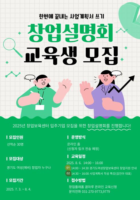 [코리아 이슈저널=홍춘표 기자] 경기도일자리재단 창업보육센터가 오는 8월 6일, 도내 여성 (예비)창업자를 대상으로 온라인 창업설명회를 개최한다.