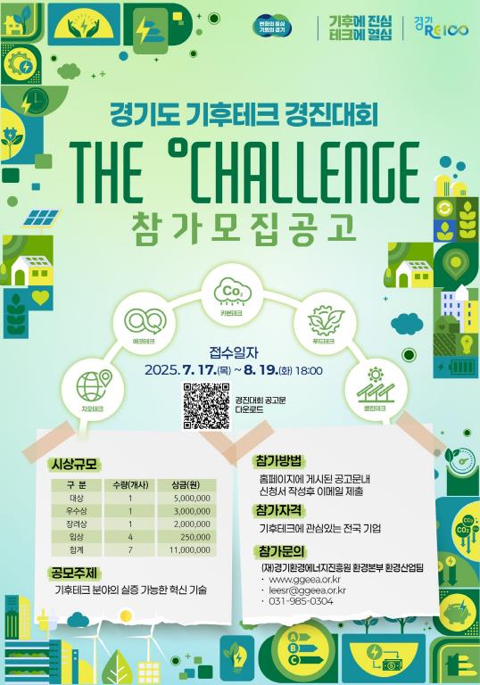 [코리아 이슈저널=홍춘표 기자] 경기도는 혁신적인 기후테크 기업의 성장을 지원하기 위해 오는 8월 19일까지 ‘2025년 경기도 기후테크 컨퍼런스 경진대회’ 참가기업을 모집한다.